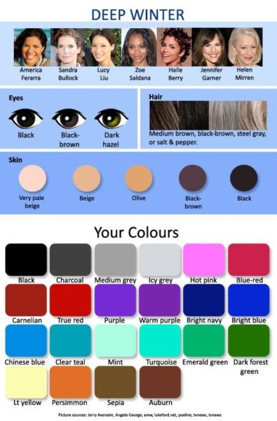- sötét tél: kreol mediterrán bőr, sötét haj és sötét szem.