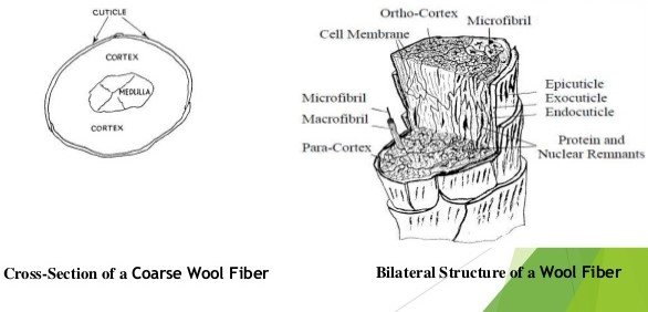 A gyapjúszál szerkezete 3 rétegből áll, a pikkelyrétegből, ( felhám v. cuticula) a kéregrétegből ( cortex) és a bélüregből( medula) áll.